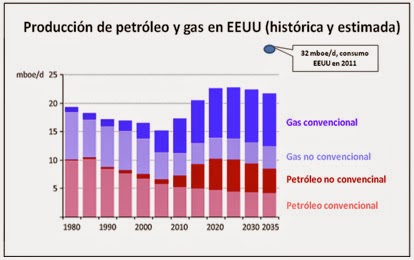 Por ejemplo, la figura muestra la producción histórica de petróleo y gas natural de EEUU desde 1980 y las previsiones hasta 2035, tanto convencional como no convencional. Se puede ver que en torno a 2010 se prevé un aumento rápido de la producción, pero también que ésta se estanca en torno a 2020 (es decir, pasado mañana) y ni el petróleo ni el gas natural llegan a alcanzar el nivel de consumo de 2011 que, para el petróleo fue de 20 millones de barriles diarios y para el conjunto del gas y el petróleo 32 millones de barriles de petróleo equivalente al día.